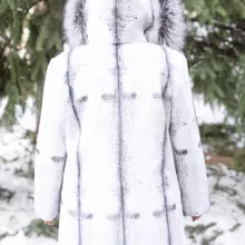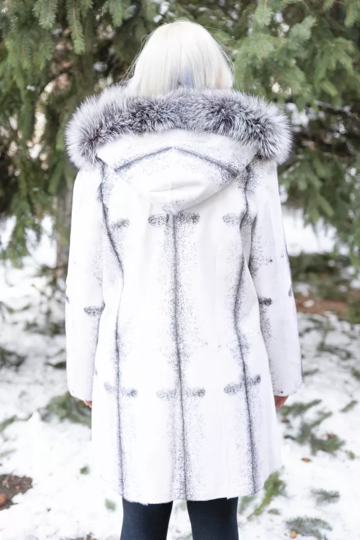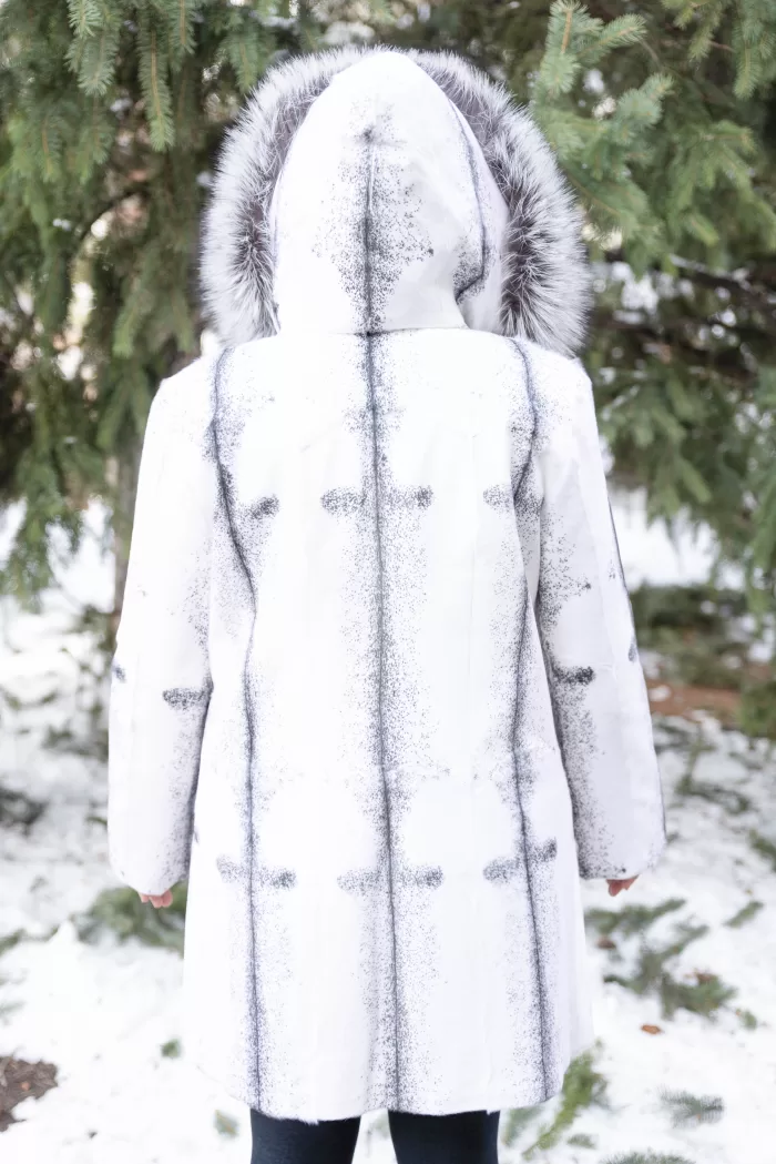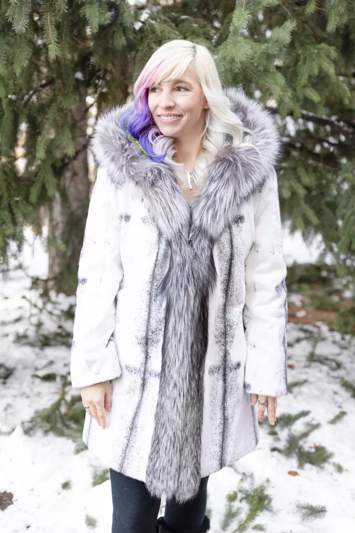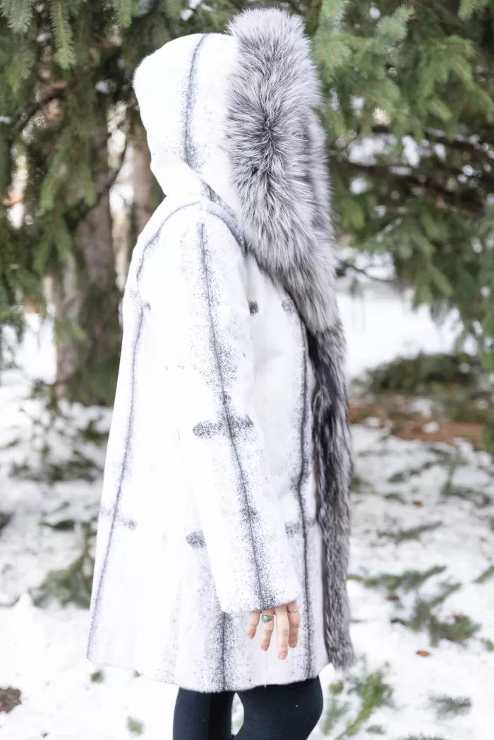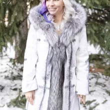 Our dyed goat skin jacket with silver fox trim offers a unique and vibrant look. This jacket has a distinct texture that’s both eye-catching and elegant. The addition of natural silver fox fur trim adds a layer of softness and sophistication.